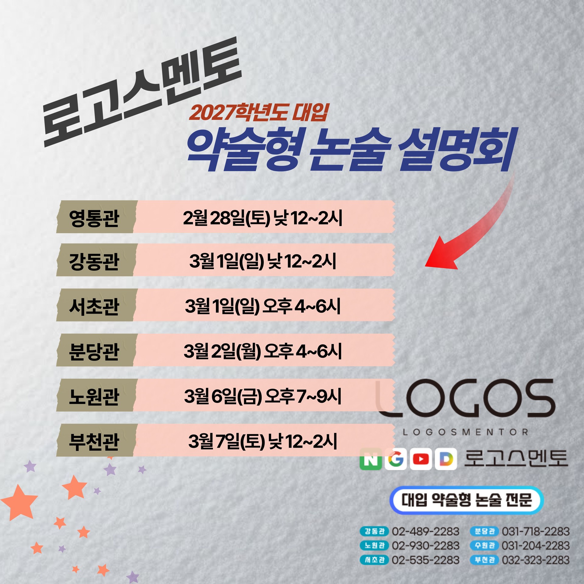 로고스멘토학원 강동, 노원, 서초, 분당, 영통, 부천관 등 직영 6개관 순회 설명회