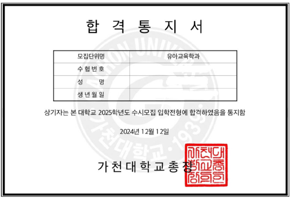 기쁘기도 가천대 유아교육학과에 합격했어요 ㅎㅎㅎㅎㅎㅎㅎㅎ!!