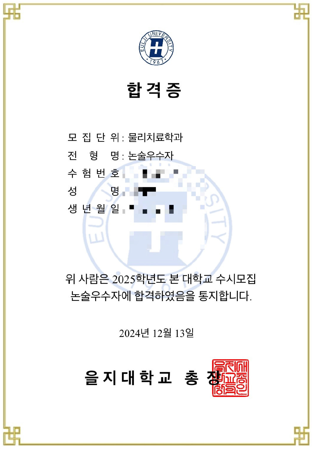 저는 보건계열로 특화된 대학교인 을지대에 약술형 논술로 합격한 학생입니다. 가천대 물리치료학과, 을지대 물리치료학과 2곳을 도전했는데 가천대는 불합격하고 을지대만 합격했습니다. 그래도 자대 병원이 여러 곳이 있는 보건계열로 유명한 대학의 보건계열 학과에 합격했기 때문에 충분히 만족합니다. 가족들도 이런 제 생각에 충분히 공감해주고 있습니다.